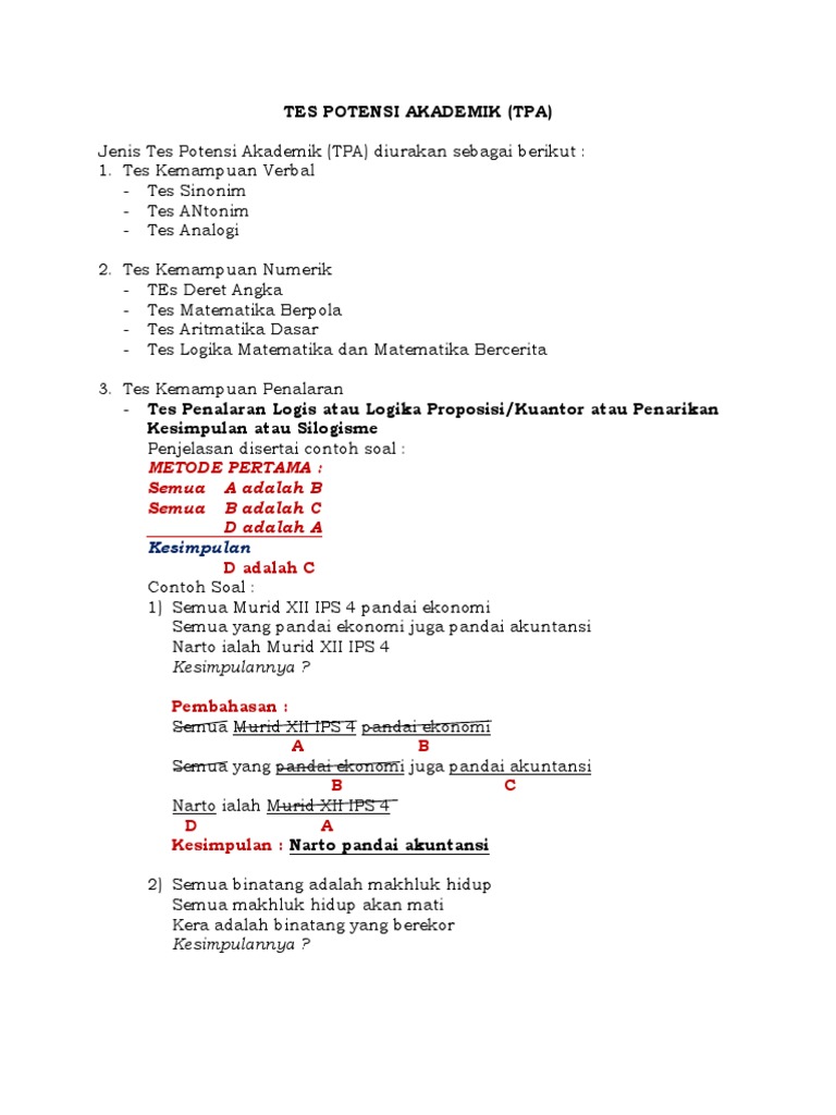 Latihan soal tes potensi akademik (tpa) kode soal : 103 free download i. tes kemampuan verbal bagian 1 : padanan kata ( sinonim) petunjuk : carilah padanan kata (sinonim) yang tepat dari kata berikut ini 1. virtual a. maya b. impian c. nyata d. virgin e. hiponema 2. semiotika a. ilmu tentang tanda b. ilmu seni c. ilmu bahasa. Contoh soal tes verbal potensi akademik dan kunci jawaban pada kesempatan kali ini saya akan memberikan kumpulan contoh soal lengkap untuk tes potensi akademik tpa dengan tema soal tes verbal yang berjumlah 114 soal yang lengkap dengan kunci jawabannya. sehingga sobat dapat belajar dirumah tanpa kebingungan dengan jawaban yang masih belum di mengerti.